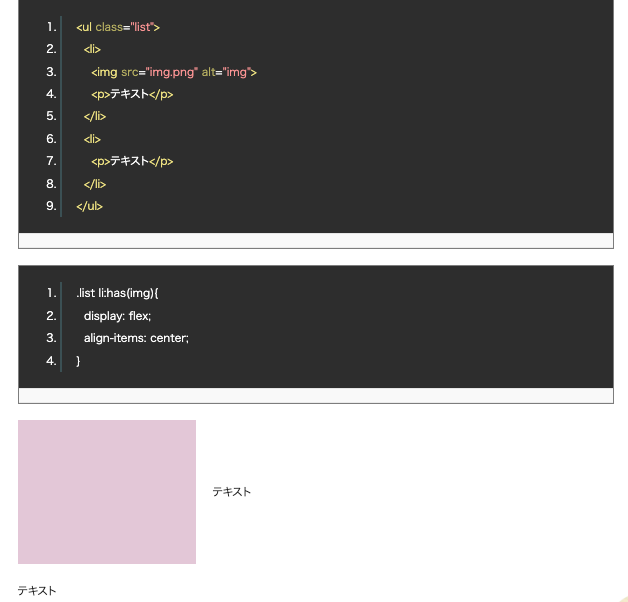 例えばliにimgタグがある場合だけ横並びにしたいときは、以下のように指定できます。